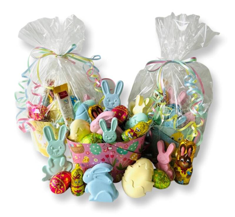 - 5x Paaschocolade (1x Paashaas, 2x hol paasei groot, 1x kuiken, 1x paaslolly