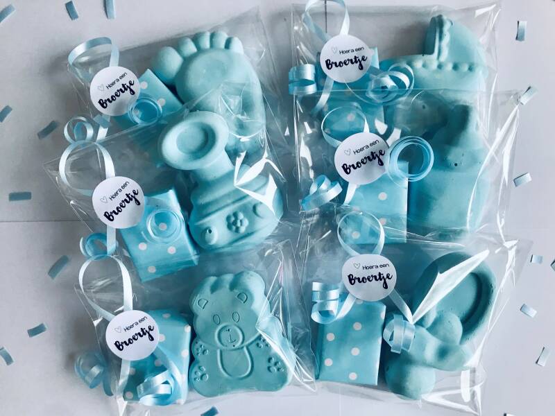 De reep wordt zorgvuldig verpakt in blauw met witte stippen inpakpapier voorzien van een sticker `Hoera een broertje`