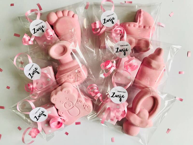 De reep wordt zorgvuldig verpakt in roze met witte stippen inpakpapier voorzien van een sticker `Hoera een zusje`