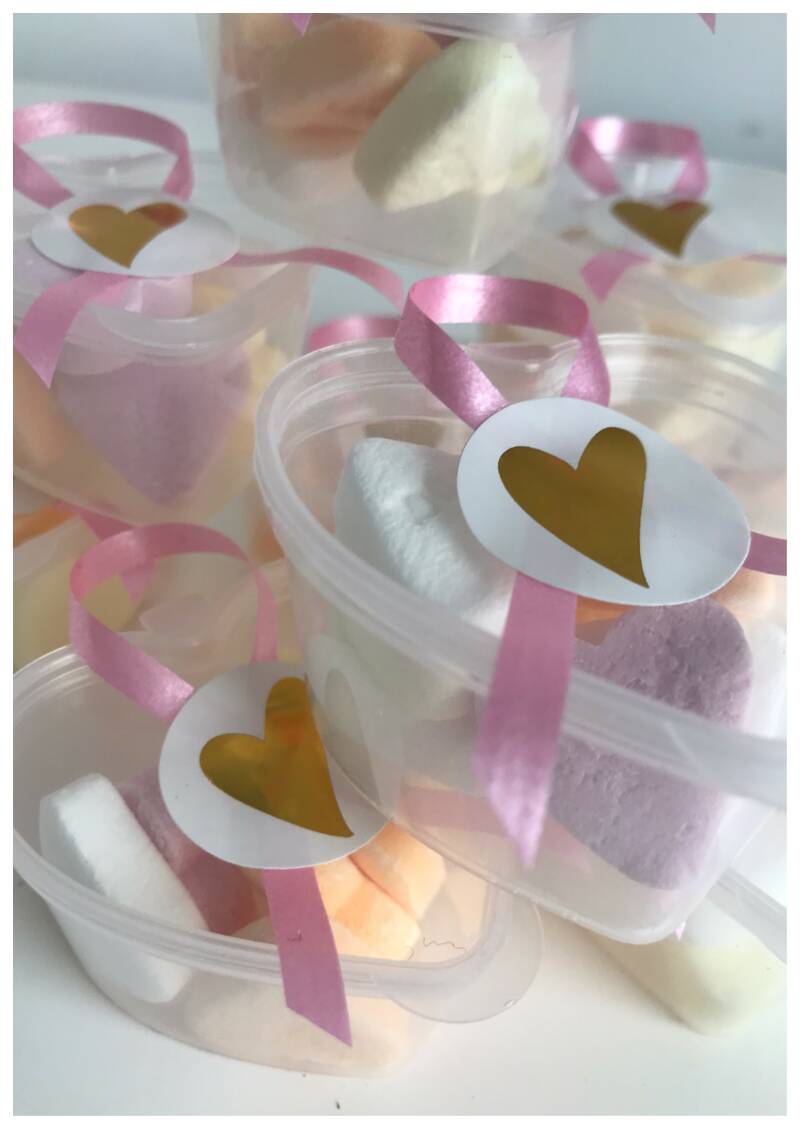 Hartjes bakjes juffen-meester traktatie. Een plastic hartjes bakje gevuld met +/- 7 hartjes.