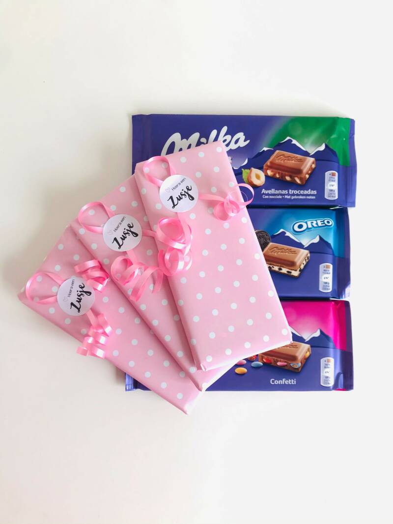 De reep wordt zorgvuldig verpakt in roze met witte stippen inpakpapier voorzien van een sticker `Hoera een zusje`