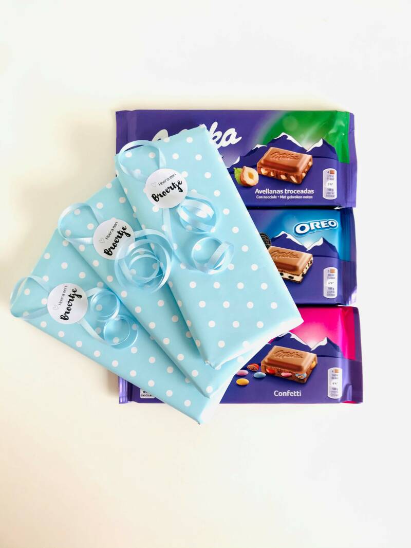 De reep wordt zorgvuldig verpakt in blauw met witte stippen inpakpapier voorzien van een sticker `Hoera een broertje`