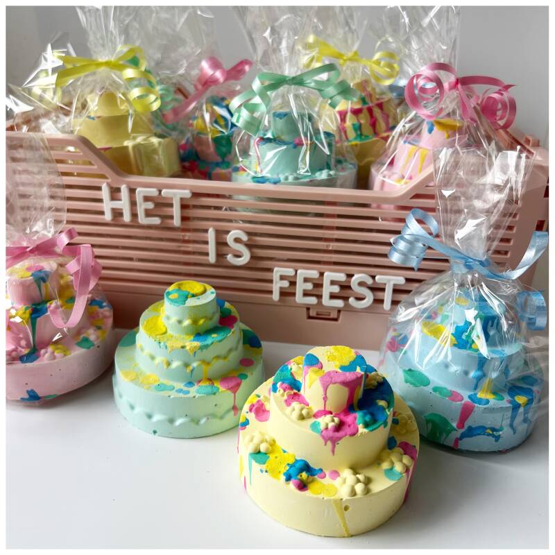 De confetti stoepkrijt taartjes wordt netjes verpakt in cellofaan. Hiervoor reken ik geen extra kosten